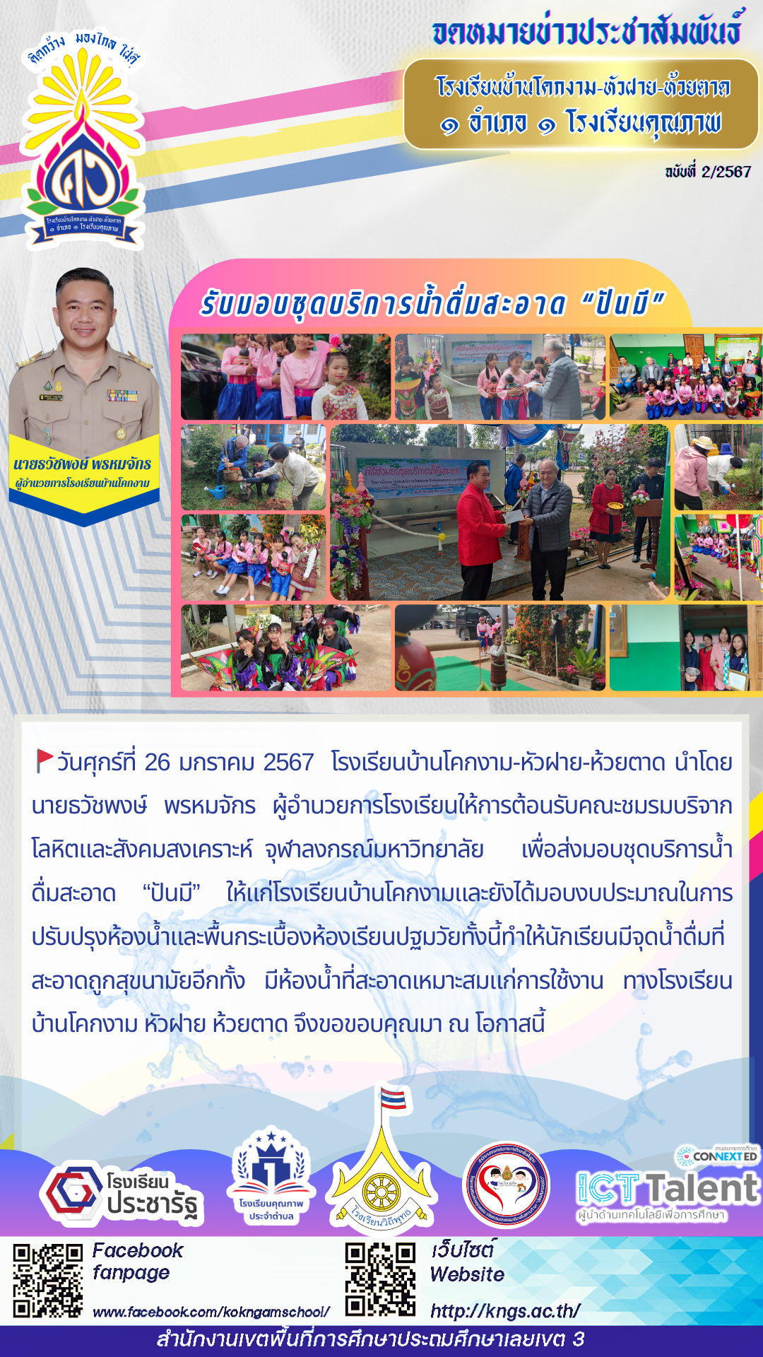 🚩วันศุกร์ที่ 26 มกราคม 2567 โรงเรียนบ้านโคกงาม-หัวฝาย-ห้วยตาด นำโดยนายธวัชพงษ์ พรหมจักร ผู้อำนวยการโรงเรียนให้การต้อนรับคณะชมรมบริจากโลหิตและสังคมสงเคราะห์ จุฬาลงกรณ์มหาวิทยาลัย เพื่อส่งมอบชุดบริการน้ำดื่มสะอาด “ปันมี” ให้แก่โรงเรียนบ้านโคกงามและยังได้มอบงบประมาณในการปรับปรุงห้องน้ำและพื้นกระเบื้องห้องเรียนปฐมวัยทั้งนี้ทำให้นักเรียนมีจุดน้ำดื่มที่สะอาดถูกสุขนามัยอีกทั้ง มีห้องน้ำที่สะอาดเหมาะสมแก่การใช้งาน ทางโรงเรียนบ้านโคกงาม หัวฝาย ห้วยตาด จึงขอขอบคุณมา ณ โอกาสนี้