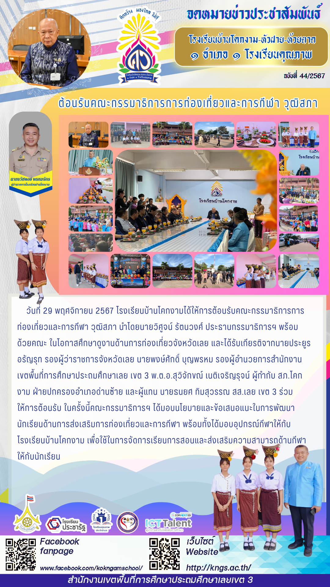 วันที่ 29 พฤศจิกายน 2567 โรงเรียนบ้านโคกงามได้ให้การต้อนรับคณะกรรมาธิการการท่องเที่ยวและการกีฬา วุฒิสภา นำโดยนายวิศูจน์ รัตนวงศ์ ประธานกรรมาธิการฯ พร้อมด้วยคณะ ในโอกาสศึกษาดูงานด้านการท่องเที่ยวจังหวัดเลย และได้รับเกียรติจากนายประยูร อรัญรุท รองผู้ว่าราชการจังหวัดเลย นายพงษ์ศักดิ์ บุญพรหม รองผู้อำนวยการสำนักงานเขตพื้นที่การศึกษาประถมศึกษาเลย เขต 3 พ.ต.อ.สุวิจักขณ์ เนติเจริญรุจน์ ผู้กำกับ สภ.โคกงาม ฝ่ายปกครองอำเภอด่านซ้าย และผู้แทน นายธนยศ ทิมสุวรรณ สส.เลย เขต 3 ร่วมให้การต้อนรับ ในครั้งนี้คณะกรรมาธิการฯ ได้มอบนโยบายและข้อเสนอแนะในการพัฒนานักเรียนด้านการส่งเสริมการท่องเที่ยวและการกีฬา พร้อมทั้งได้มอบอุปกรณ์กีฬาให้กับโรงเรียนบ้านโคกงาม เพื่อใช้ในการจัดการเรียนการสอนและส่งเสริมความสามารถด้านกีฬาให้กับนักเรียน